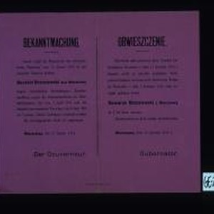 Bekanntmachung. Durch Urteil des Feldgerichts ... Gouvernements Warschau ... ist der russiche Untertan ... zu sieben Jahren ... verurteilt worden ... Warschau, den 12. Januar 1916 ... Obwieszczenie. Wyrokiem sadu polowego ... za ... posiadanie broni ... na 7 lat ... Gubernator
