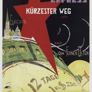 A poster advertising the Trassibirian Express, "a shortest way from Europe to the Far East". Captions read, "Der Transsibirische Express, kürzester weg von Europa nach Dem Ferner Osten Intourist. Moskau. Hotel Metropol. Vertreten durch alle grossen Reisebüroz der Welt", meaning, "The Transsiberian Express, the shortest way from Europe to the Far East. Intourist. Moscow. Hotel Metropol. Offered [represented] by the world’s biggest travel agencies". [Description English/roman)]