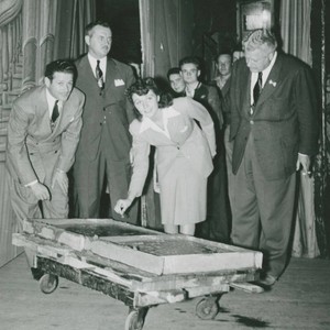 Public relations event at the Strand Theatre with screen actor Duncan Renaldo (left), an unidentified person (center) Alan Hale, Sr. (right) signing a concrete slab at the Strand Theatre while others look on; the slab was later installed on the sidewalk to promote safe street crossing, circa 1930s.