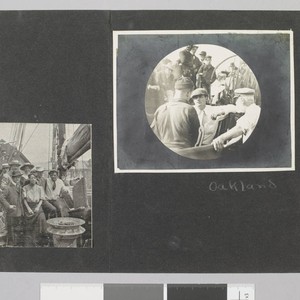 Two images affixed to photo album page. Left photo is of Jack and Charmian London and a group of people on the deck of the Snark. The right photo is cropped into a circular frame and shows Jack London talking to crewman on the Snark. Title and date transcribed from envelope. Front of album page reads: "Oakland." Verso of page reads: "The Nature Man about Snark." and refers to a photo that must have been previously mounted on that page.