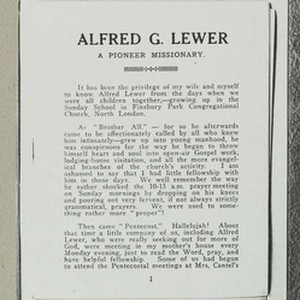 Tribute from Donald Gee [4 pages] photo missionary application forms and references correspondence telegrams regarding Lewer's death. [Description English/roman)]