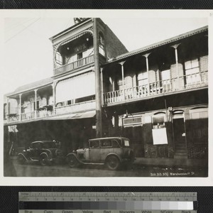 View of two- and three-story brick buildings on Marchessault Street in Old Chinatown, Los Angeles. The building in the middle is Man Jen Low Cafe and has three floors. Automobiles are parked in front of the restaurant. Title transcribed from photograph.
