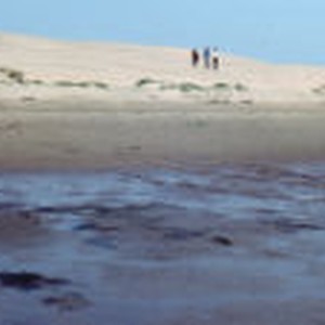 Three students walk along sand dunes sprinkled with Widgeongrass at the edge of the Morro Bay tidal flats.