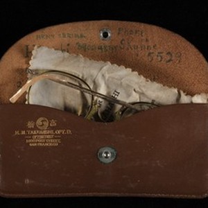 A pair of wire-framed eyeglasses, a glasses case, and glasses cleaning cloth belonging to Hiroshi Sugiyama, 2580 McAllister Street, San Francisco, California, USA, 1940/1945. Glasses case is inscribed with Sugiyama's name, address, phone number, and Army identification number, as well as his optometrist's contact information: Henry M. Takahasi, 1600 Post Street, San Francisco, California, USA. The cleaning cloth has "Have your eyes examined once a year... guaranteed chemically treated, Confirm our statement a) Moisten one lens on both sides. b) Wipe thoroughly c) Repeat with second lens as above. d) Now try to steam your eyeglasses." written on it, along with Henry M. Takahasi's offices: 1600 Post Street, San Francisco, California, USA, 514 18th Street, Oakland, California, USA, and 1935 Blake Street, Berkeley, California, USA.