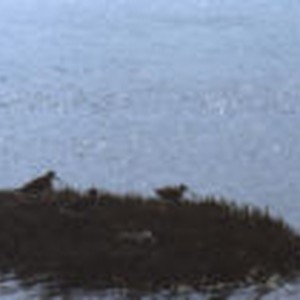 Two marbled godwits and a willet walking along grass at shoreline.