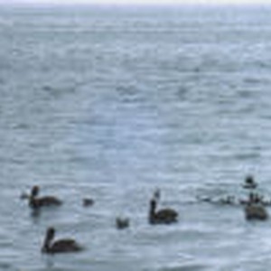 Pelicans feeding on a school of anchovy.