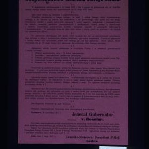 Rozporzadzenie ... Warszawa, 21 kwietnia 1917 r. General Gubernator v. Beseler. ... Lodz, dnia 1 maja 1917 r. Cesarsko Niemiecki Prezydent Policji Loehrs