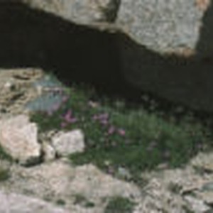Rock fringe showin vibrant pink flowers.