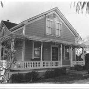Photo, black and white: Sebastopol house at 218 Florence Avenue a Greek Revival built in 1890 in the Murphy Addition. Known as the Borba House. House photographed in 1993 by Evelyn McClure for her book "Sebastopol, California : History, Homes and People."