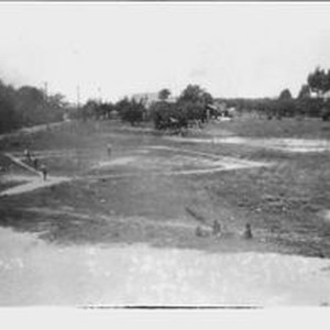 Photo black and white: Boys at recess on the boy's side of the playground at Sebastopol Primary school on the baseball field about 1920s. Orchard and buildings can be seen in distance.