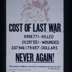 Cost of last war, 9,998,771 - killed, 20, 297, 551 - wounded, 337,946,179,657 - dollars. Never again! "Our hundred millions want less of armament and none of war" - President Harding
