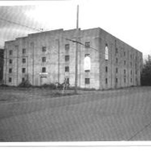 Photo--black and white: The Speas Manufacturing and Distillery plant in Sebastopol at the corners of McKinley and Petaluma Avenue circa 1990s. The Speas plant was built in 1919 by Frank Butler and was subsequently sold to Speas in 1929. The company made and stored vinegar and distilled apple brandy. This photo shows the plant at a time when it was up for sale in the 1990s. It was subsequently sold and turned into the Sebastopol Cinemas in 1993.