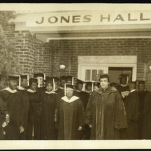 Packet 3: photograph of Dr. Mallory and graduating class, in front of Jones Hall, Saints Industrial School, [s.d.]. "Dr. Mallory with graduating class & Saints in Lexington". [Description English/roman)]
