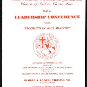 Program of the Texas Southeast Second Ecclesiastical Jurisdiction, Church of God in Christ (COGIC), Leadership Conference, "Blooming in your ministry", New Abundant Life Church of God in Christ (COGIC), Waco, Texas, 1995 September 30. [Description English/roman)]