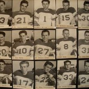 Photo--Black and white: Analy High School Tigers Football, 1953. Individual photos: Top row R-L: Foster, Mike Leach, Jerry Miller, Bill Hutchens, Gilbert Pinola, Langford. Middle row: Lee, Don Perry, Tom Elder, Donnie Bohn, Bob Pavoni, Nick. Bottom Row: Napoli, Charles Holley, Stan Pasquinelli, Elmo Listoe, Brian Schultz, Burt.
