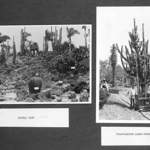 Two photographs mounted on a black page, labeled "General view" (with an MS inscription of "1935") and "Transplanting large cereus N. B-16." Written on the second photo in the bottom right corner, "W. Hertrich 1925." William Hertrich was Superintendent of Botanical from 1927 to 1949.