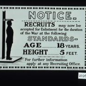 Notice. Recruits may now be accepted for enlistment for the duration of the war at the following standards. Age, 18 years. Height, 5 ft. For further information apply at any recruiting office