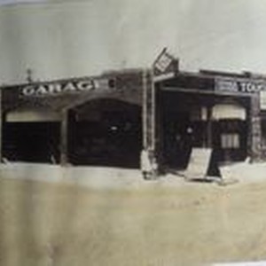 Photo--black and white: The Tough Bros. Garage circa 1920s. Located at corner of Burnett (on left in photo) and Petaluma Avenue. John Alexander Tough (1892-1964) lived at 158 Calder Avenue in Sebastopol. Woman in photo possible John's wife Inez (1892-1982) and son Teddy T. (1918-2000).