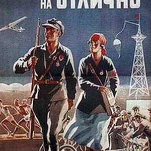 A poster dedicated to the military training of the soviet youth. Captions read, "Komsomol'tsy! Voennyi ekzamen sdadim na otlichno! / Комсомольцы! Военный экзамен сдадим на отлично", meaning, "Komsomol members! Let's pass the military exam with a highest grade". [Description English/roman)]