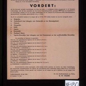 Bekendmaking ... alle hieronder vermelde vreemdeli.gen, die thans hun woon- of verblijfplaats hebben of vertoeven in de Gemeente 's-Gravenhage, zich bij hem aanmelden aan het bureau Vreemdelin gedienst ... 'sGravenhage, 25 Juli 1945 ... G.W. Valken