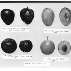 Photo, black and white: Burbank Plums August 15th. Four plums (each with whole and half) with caption under each. " ZZ-1 (Very small limb-upper part of South Branch)" ; "TT-19 (All except east branch) XXXX"; "XX-4 (West Branch) "Purple July 8th) XX"; "B-8 (West Branch) "Pearl" XXXX."