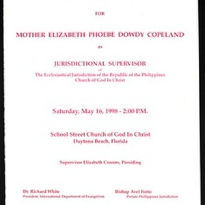 installation service program, Elizabeth Phoebe Dowdy Copeland, School Street Church of God in Christ, Daytona Beach, Florida, 1998 May 16. [Description English/roman)]