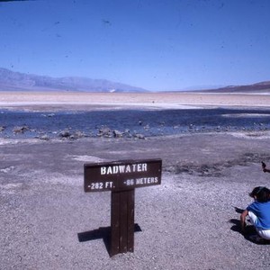 Slide shows two children near a pool at Badwater. One child is holding what appears to be a toy pistol. The sign next to them reads: "Badwater. -282 ft. -86 meters." Badwater Basin is the lowest point in North America at 282 feet below sea level. Scanned with Epson Perfection V700 Photo as 3200 dpi TIFF image in 24 bit RGB color.