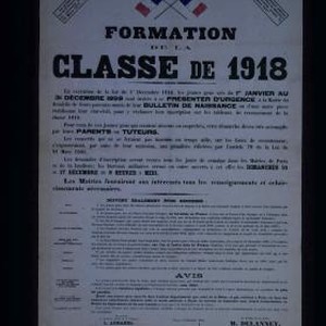 Formation de la classe de 1918. En execution de la loi du 1er decembre 1916, les jeunes gens nes du 1er janvier au 31 decembre 1898 sont invites a se presenter d'urgence a la mairie du domicile de leurs parents, munis de leur bulletin de naissance ou d'une autre piece etablissant leur etat-civil, pour y reclamer leur inscription sur les tableaux de recensement de la classe 1918