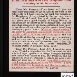Typical letters received by Mr. C. Arthur Pearson, the President of the National Institute for the Blind, from men who have completed their training at St. Dunstan's. "Dear Mr. Pearson, Your letter will give me great encouragement to go on and do my best in my future life as I have done in the past few months at St. Dunstan's ..."
