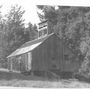 Photo--black and white: Early wood fired apple dryer probably late 1800s near Occidental. This was probably one of the first dryers built in the area. A wood fired brick kiln built in the floor of the building. Flat racks of sliced apples stacked within the building would be dried by the fire. Sulfur was added to fire to keep the apples from turning brown. A worker with a large flat shovel would turn the apple slices to be evenly dried. The exhaust (chimney) is seen at the top of the kiln.