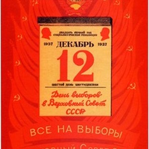 A poster encouraging Soviet people to participate in elections for the Verkhovnyi Soviet (Supreme Council / Soviet) of the USSR. The calendar leaf reads, "12 dekabria, 1937. Den' vyborov v Verkhovnyi Sovet SSSR / 12 декабря 1937. День выборов в Верховный Совет СССР". Captions at the bottom read, " Vse na vybory v Verkhovnyi Sovet SSSR! / Все на выборы в Верховный Совет СССР!" meaning, "Everybody, participate in elections for the Supreme Soviet of the USSR!". [Description English/roman)]