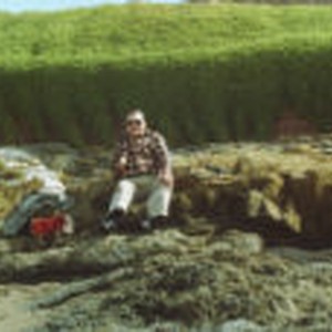 Gerhard sits and eats his lunch on the beach at Cambria.