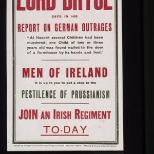 Lork Bryce says in his report on German outrages: "At Haecht several children had been murdered; one child of two or three years old was found nailed to the door of a farmhouse by its hands and feet." Men of Ireland: It is up to you to put a stop to the pestilence of Prussianism. Join an Irish regiment to-day