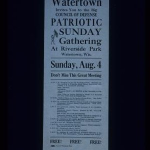 Watertown invites you to the big Council of Defense patriotic Sunday gathering at Riverside Park, Watertown, Wis. ... 10:00 A.M. program in the big waterproof tent ... 12:00 M. Basket Dinner ... Free free free!