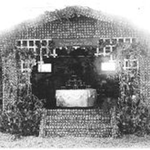 Postcard--black and white: 1915 Gravenstein Apple Show exhibit of a house made of apples by the Pleasant Hill Home Culture Club.