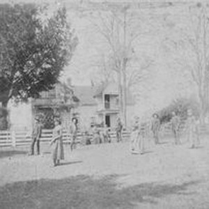 Photo--black and white: Photo probably of the A. J. Peterson family. Andrew Jackson Peterson was married to Ludencia Sebring who was the first daughter of Margaret and Thomas Sebring. The family is playing croquet in front of their house in Santa Rosa