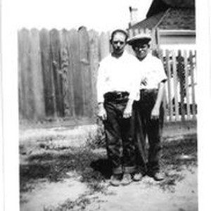 Photo--black and white: Raymond Spiller and Harry White circa 1930s . Boys are in jeans and shirts against wooden fence and are probably around 13 years old.