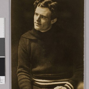 A half-length seated studio portrait of Jack London in a sweater, with his head turned to the left, holding a cigarette in his left hand. Title devised by cataloger, date based on a smaller print, JLP 184, which was printed as a mirror image.