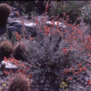 Bush with red-orange flowers surrounded by cacti and stones.