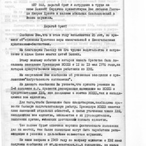 Notice of a meeting of the Presidium of the AUECB (All-Union Council of Evangelical Christian-Baptists), 12-13 May 1970, in which the AUECB plans a project on the 25th anniversary of the unification of AUECB with the CEF (Christians of Evangelical Faith) and CFE (Christians of Faith Evangelical), to visit workers in some areas on the unity of CFE. Included is the 1970 schedule of interviews of regional the Presbyterian Council on the issue of unity with the CFE. [Description English/roman)] Сообщение о заседании Президиума ВСЕХБ (Всесоюзный совет Евангельских Христиан-Баптистов), 12-13 мая 1970 г., в котором план, на 25-й годовщиной ВСЕХБ с ХЕВ (Христиан Евангельской Веры) и ХВЕ (Христиан Веры евангельской), посещения работниками ВСЕХБ некоторых областей по вопросу единства с ХВЕ на 1970 год. В комплект входит График проведения собеседовании при областных Пресвитерских Советах по вопросу единства с ХВЕ. [Description (original non-English/roman language/script)]