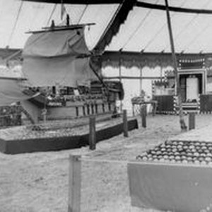 Photo--black and white, from Borba 8" x 10" celluloid negative: Gravenstein Apple Show display of the Mayflower made of apples. In the background a display by the Santa Rosa Furniture Co. Hand scratched at bottom of photo "Borba Photo Sebastopol."