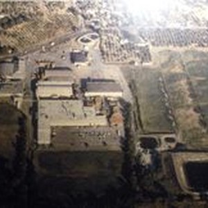 Photo--Color, mounted: Aerial photo of the Sebastopol Coop Cannery--later Vacu-Dry apple processing plant. Numerous buildigs are seen on the cannery campus. The highway at the top is Highway 116 (North to the left). The intersecting road is Occidental Road traveling east to west.