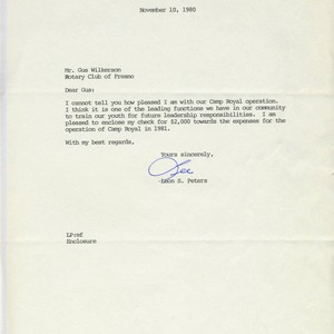 Leon Peters letter regarding gift to Camp Royal
