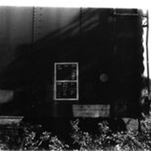 Photo--black and white: P&SR (Petaluma and Santa Rosa) railroad box car put in place behind the Sebastopol P&SR railroad depot that has become the West County Museum run by the Western Sonoma County Historical Society.