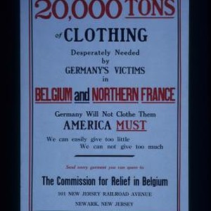 20,000 tons of clothing desperately needed by Germany's victims in Belgium and northern France. Germany will not clothe them America must. Send every garment you can spare to The Commission for Relief in Belgium, 101 New Jersey Railroad Avenue, Newark, New Jersey