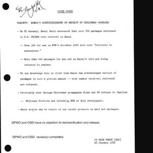 PW Task Force point papers on Hanoi's receipt of Christmas packages, political situation in Southeast Asia, and notes on secretary of defense staff meeting