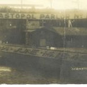 Postcard--black and white photo- Gravenstein Apple show 1913 display of Sonoma Mission in apples. Signs made with apples: "Sebastopol Parlor No. 143" (Native Sons of the Golden West) "Sonoma--June 14, 1846" commerating Bear Flag Revolt. Background: General Albert M. Winn, a Virginian who came to California in the Gold Rush, organized the Native Sons of the Golden West in 1875 whose purpose was to celebrate the fortitude of the men and women pioneers who emigrated to California.