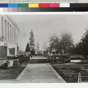 A view of the area immediately south of the library building during its construction. The fountain and paths are in place, but the statues are not. MS note on verso reads: "Huntington library, c. 1920."