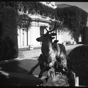 View of the bronze sculpture, Stag Hunt, after Jacques Houzeau,. with the south terrace in the background. Label accompanying photograph in album reads "HEH 2 Terrace, Huntington Art Gallery. In foreground, bronze group, "Stag Hunt," by Houzeau. French, XVII c."