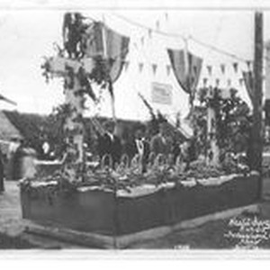 Postcard photo, black and white: A 1911 Gravenstein Apple Show exhibit by Healdsburg California show three men standing behind a table covered in fruit and apples. The photo on the postcard taken by M.D. Silberstein.